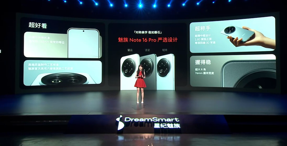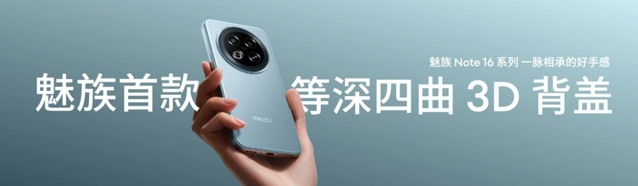 魅族 Note 16 Pro 可选三款配色,采用全居中对称机身、6.75mm 厚度,搭载魅族首款等深四曲 3D 背盖,还有超大屏幕 R 角。