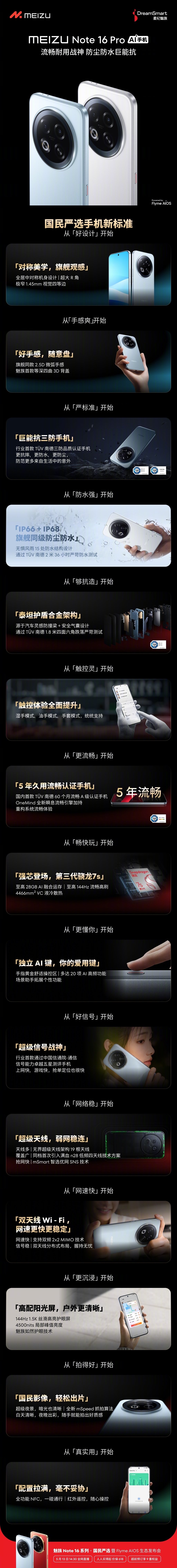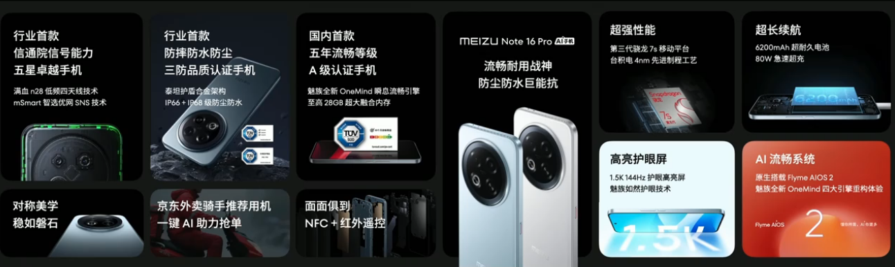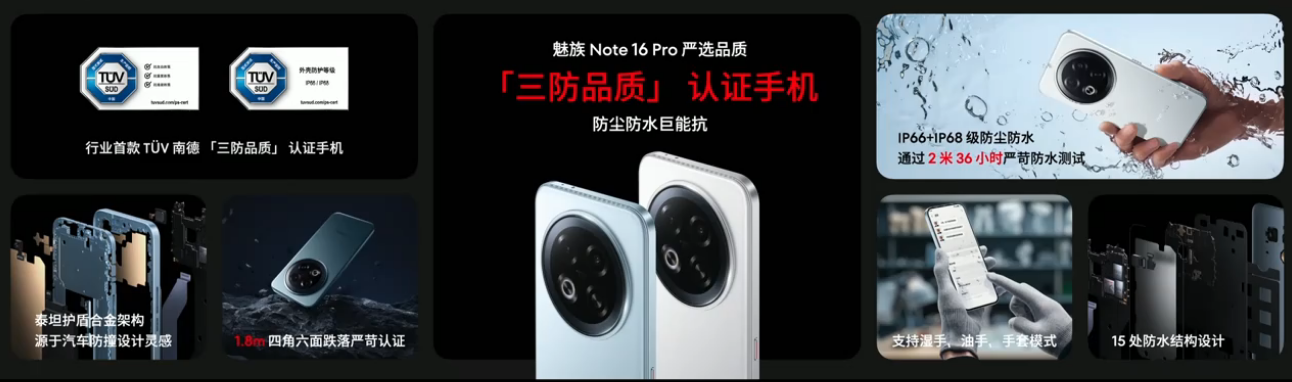 此外,魅族 Note 16 Pro 采用了手机“防撞梁”结构设计、“安全气囊”设计,还支持 IP66+IP68 防尘防水,拥有湿手、油手、手套模式,甚至放在火锅里拿出也能正常使用;通过了 1.8 米四角六面防摔、2 米 36 小时防水测试,成为了行业首款 TÜV 南德 「三防品质」 认证手机。