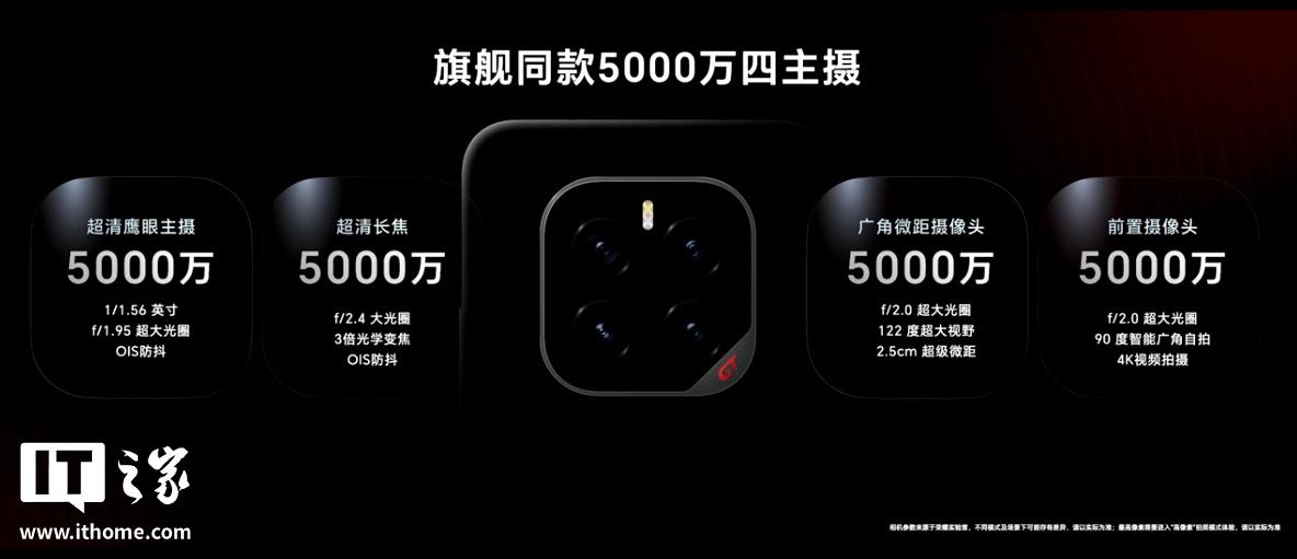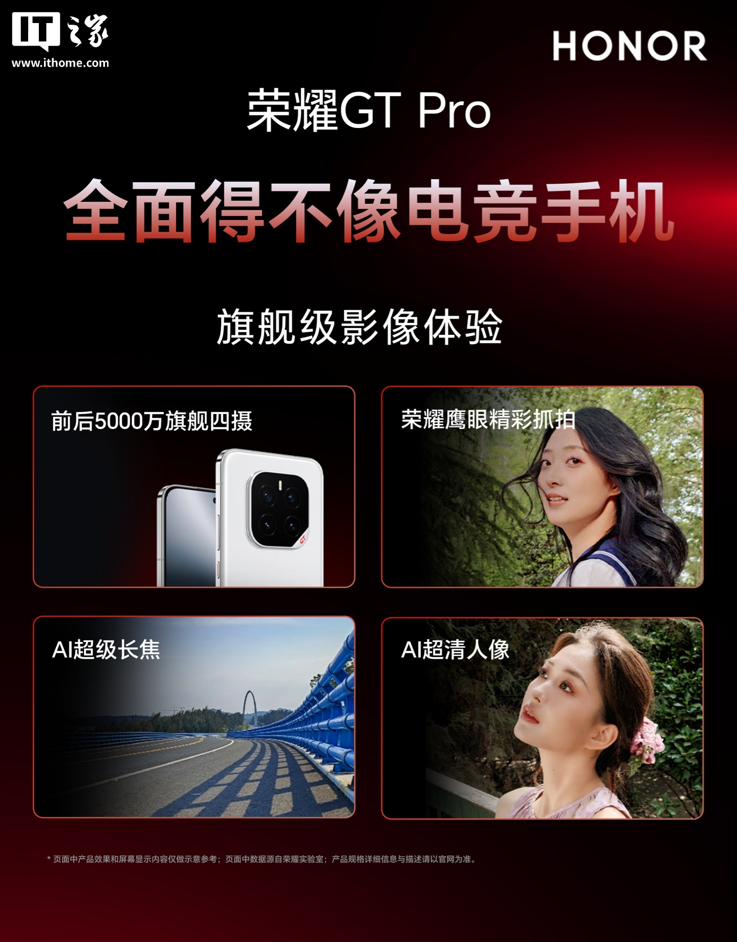 荣耀 GT Pro 手机还配备旗舰同款 5000 万四主摄,后摄包括:超清鹰眼主摄、超清长焦、广角微距摄像头;前置 5000 万像素镜头。新机支持旗舰同款 AI 鹰眼抓拍、AI 超清人像、AI 超级长焦。