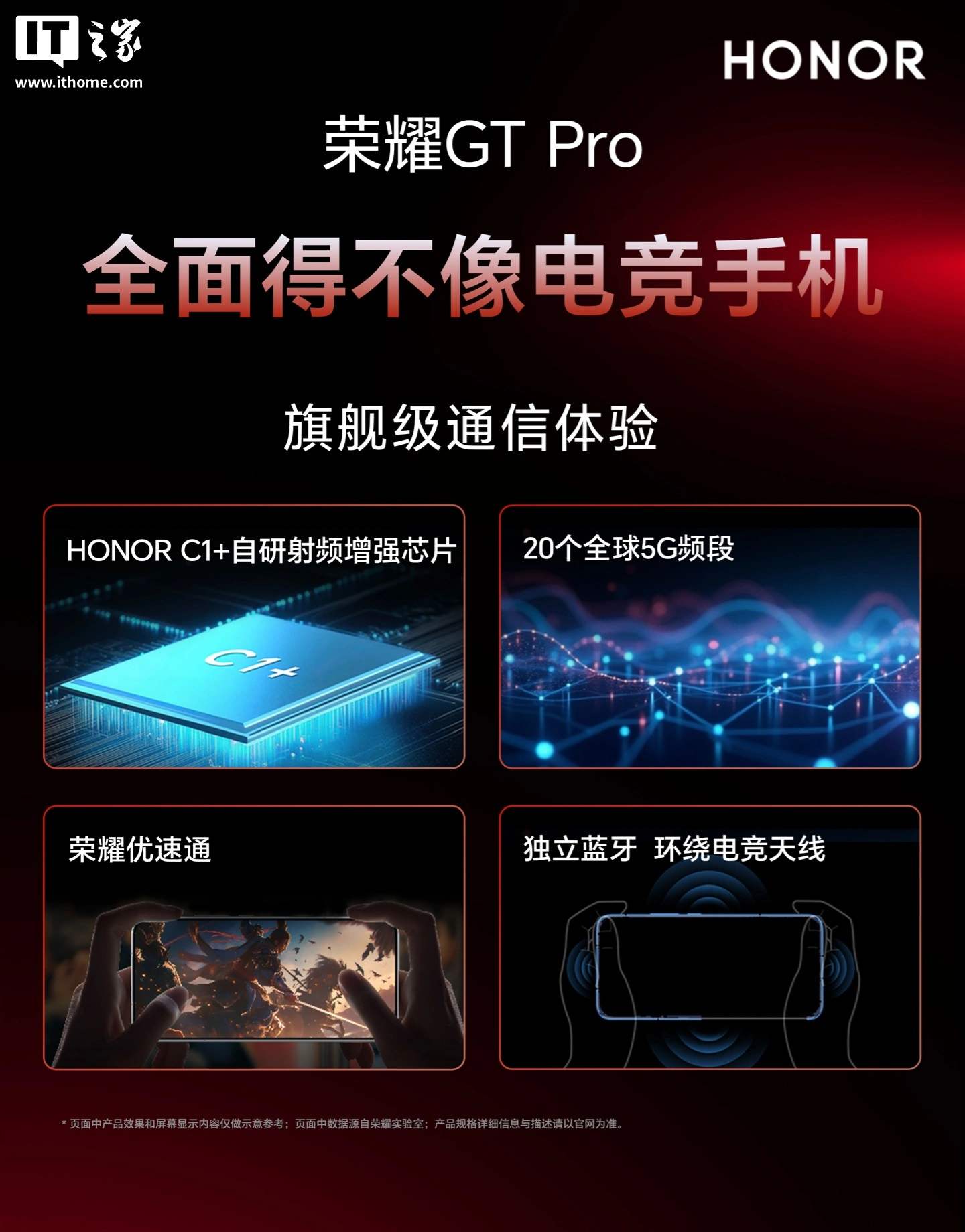 荣耀 GT Pro 手机搭载 HONOR C1+ 自研射频增强芯片,支持 20 个全球 5G 频段;预置荣耀优速通、配备独立蓝牙 & Wi-Fi 天线架构,拥有环绕电竞天线。
