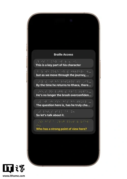 苹果的盲文访问功能可将用户的苹果设备转变为一个深度集成到苹果生态系统中的全功能盲文记录器,用户可以通过盲文屏幕输入或连接的盲文设备进行输入,轻松打开任何应用程序。借助盲文访问功能,用户可以快速以盲文格式记笔记,并使用奈梅特盲文(Nemeth Braille,一种常用于课堂数学和科学教学的盲文代码)进行计算。此外,用户还可以直接从从“盲文访问”中打开盲文就绪格式(BRF)文件。这将解锁“大量以前在盲文记录设备上创建的书籍和文件”。该功能还与苹果强大的实时字幕功能相结合,允许用户在盲文显示器上实时转录对话。