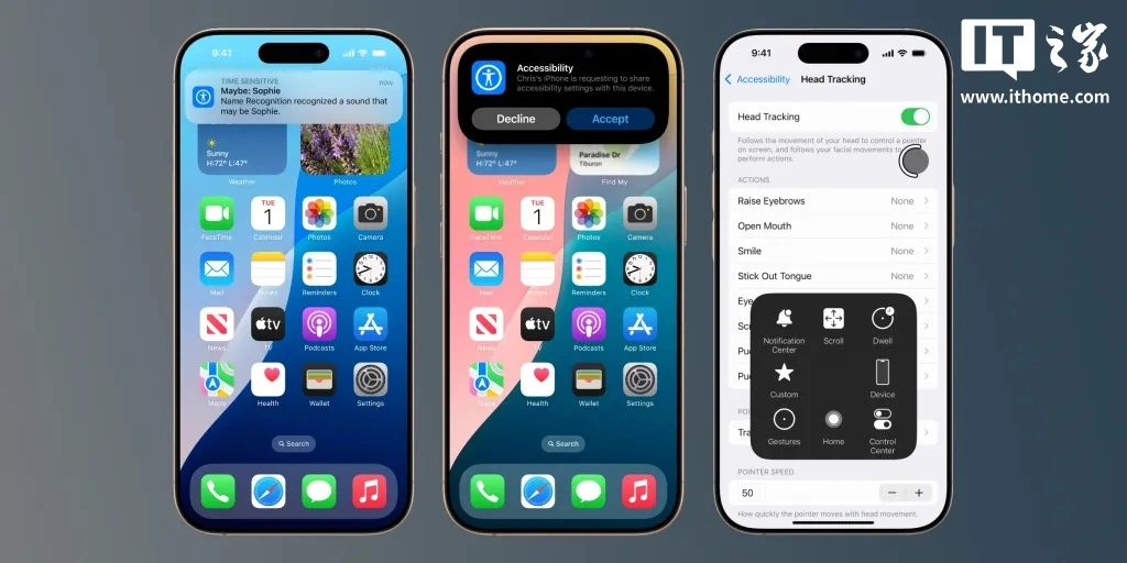 CarPlay 的更新包括对大字体的支持,以及对声音识别功能的扩展,驾驶者或乘客现在可以收到车内婴儿哭声的提醒,以及车外的喇叭声和警笛声。此外,苹果还推出了“共享无障碍设置”功能,用户可以快速、临时地将无障碍设置共享给另一部 iPhone 或 iPad,这对于借用朋友设备或在咖啡馆等场所使用公共终端非常方便。