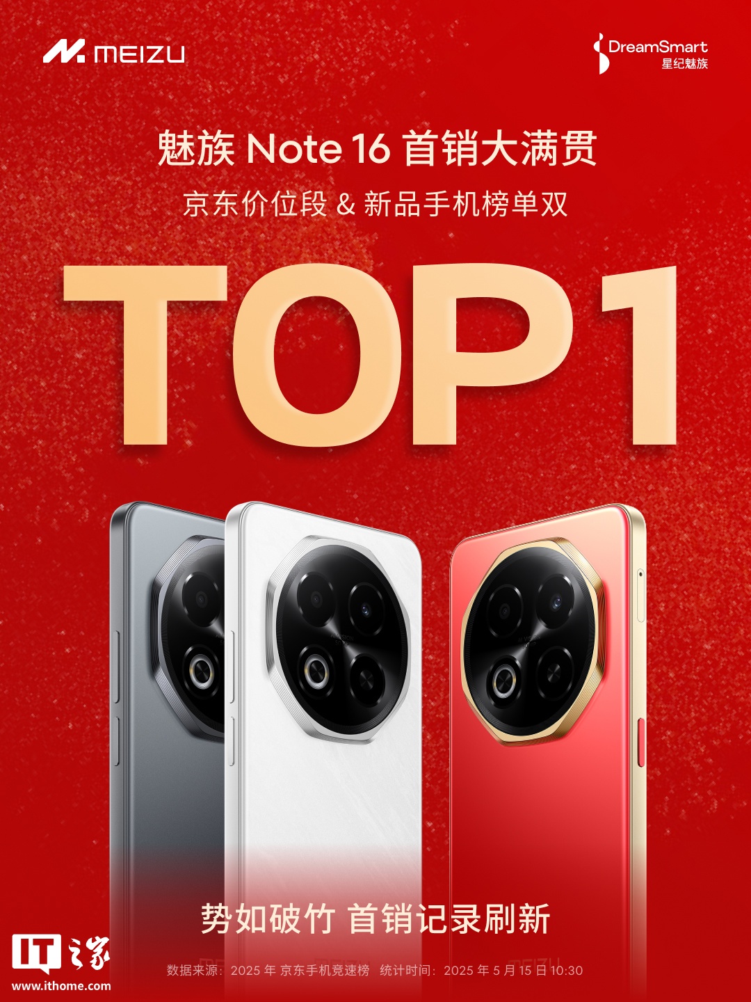 IT之家 5 月 15 日消息,星纪魅族科技今日发文宣布,Note 16 系列手机首销刷新记录,登顶京东价位段 & 新品手机榜单双 TOP 1(数据来源:2025 年京东手机竞速榜;统计时间:2025 年 5 月 15 日 10:30)。