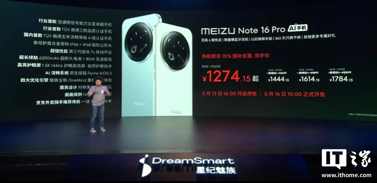 据IT之家此前报道,魅族 Note 16 / 16 Pro 手机发布于今年 5 月 13 日,新机分别搭载紫光展锐 T8200 Flyme 特调满血版处理器 / 骁龙第三代 7s 处理器,售价 799 元起(国补后 679.15 元起)/ 1499 元起(国补价 1274.15 元起)。