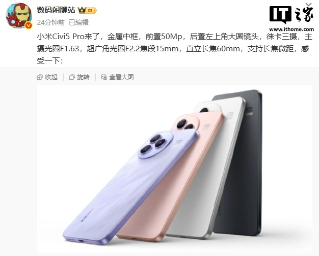IT之家从博主 @数码闲聊站 爆料获悉,小米 Civi 5 Pro 采用金属中框,前置 50Mp,后置左上角大圆镜头,徕卡三摄,主摄光圈 F1.63,超广角光圈 F2.2、焦段 15mm,直立长焦 60mm,支持长焦微距。
