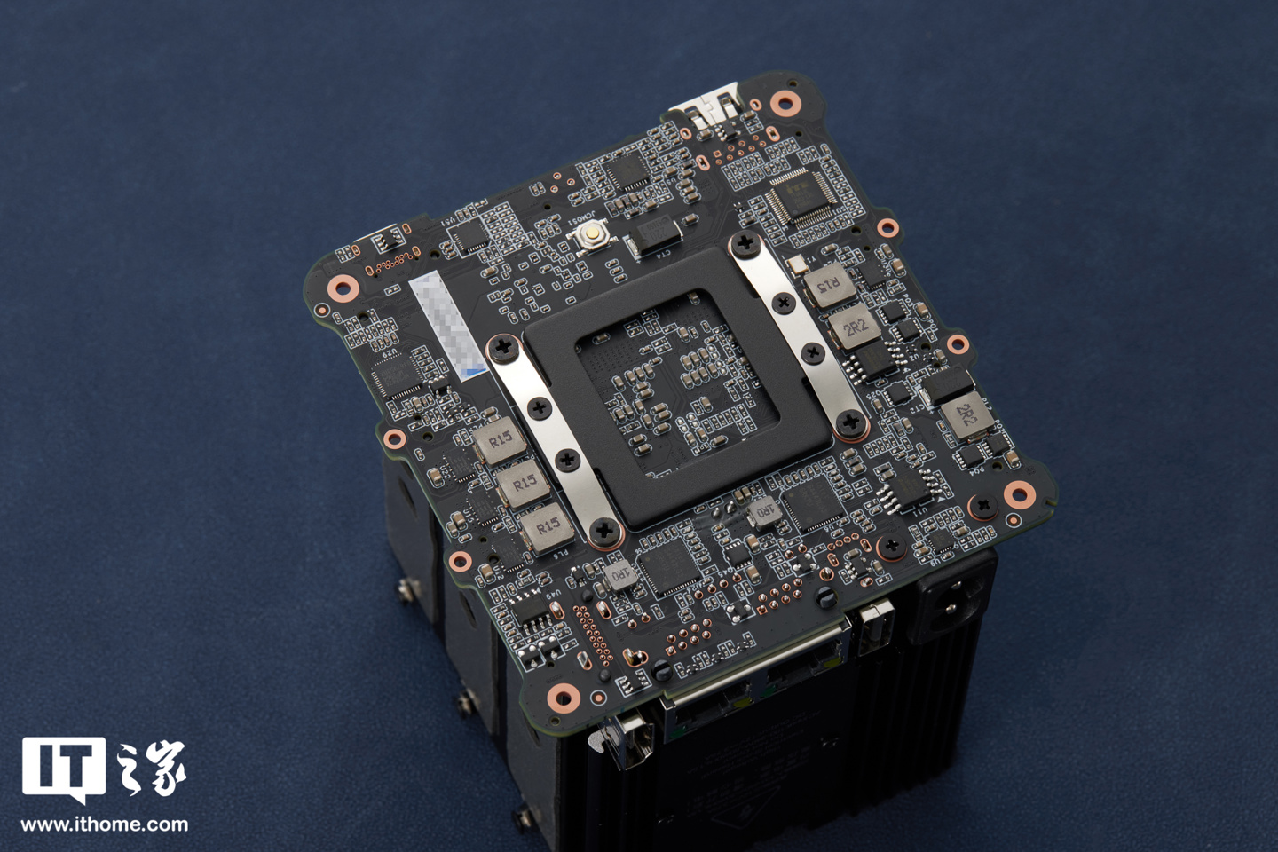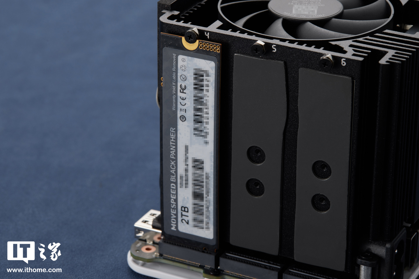 我们可以看到,其内部采用了模块化金属框架,包括主板 / 存储 / 散热三明治结构,六个 M.2 硬盘插槽(兼容 2230/2242/2280)位于机身两侧,默认预装了六个导热垫(导热垫未覆贴膜,NAND 闪存芯片应贴合内侧散热鳍片方向),且分别标注有 123、456,在细节方面做得非常不错。