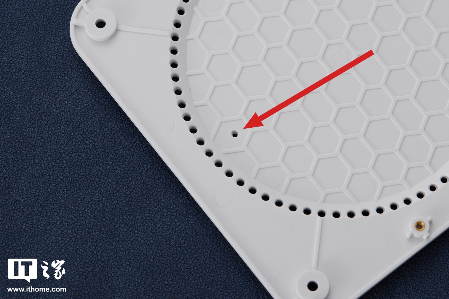 拆下四颗固定螺丝,我们就可以轻松拆下机身底板,在其中我们还可以看到一圈散热小孔,并且中间还隐藏了一个神秘小孔(可以透过小孔按下主板上的 BIOS 复位键)。
