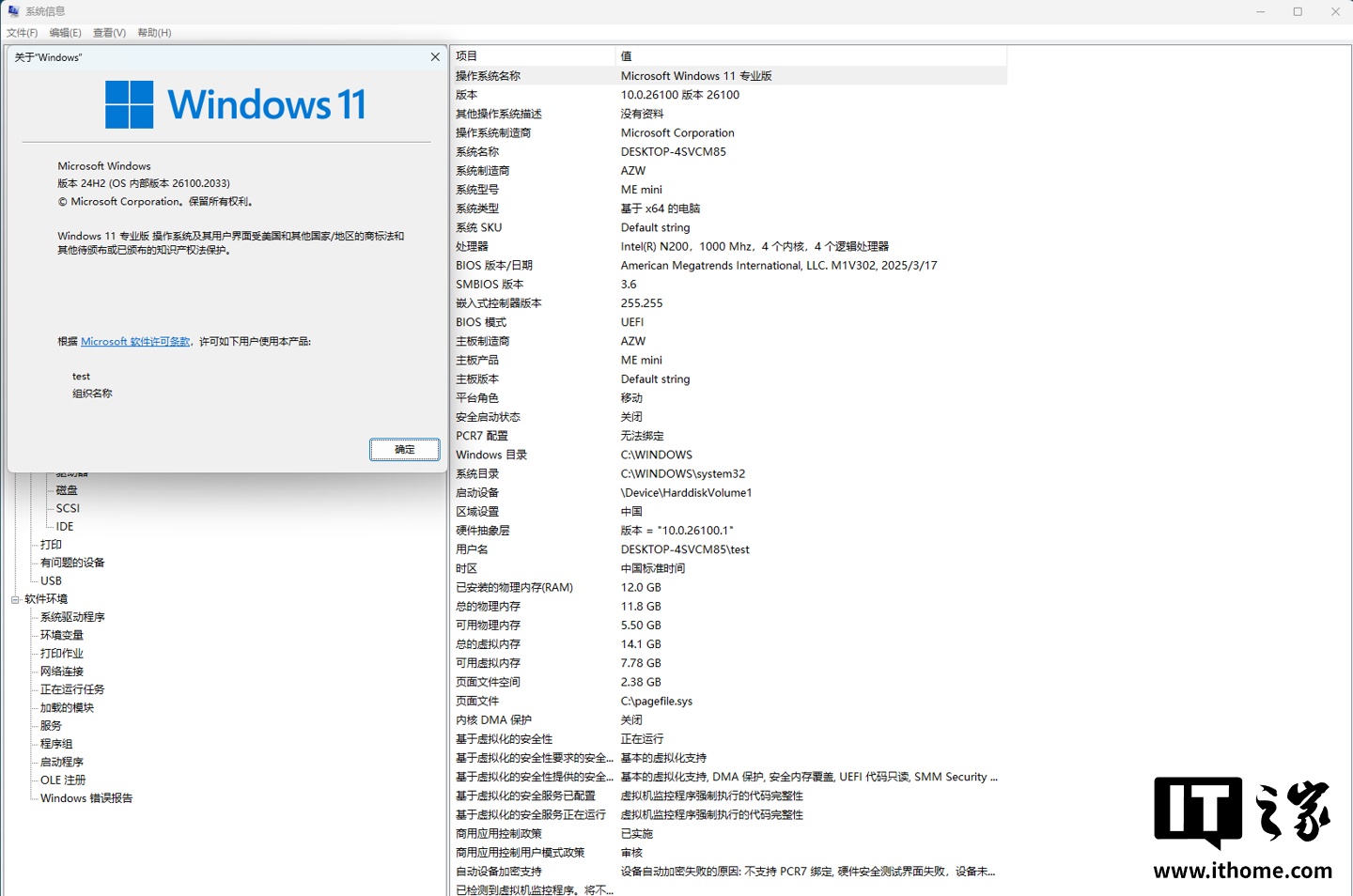 这款小主机内置了 64GB 的 eMMC 存储,开箱预装正版 Windows11 专业版(24H2)系统,开机联网即可自动激活,比较适合轻办公类用户使用。