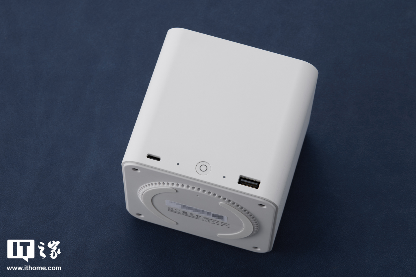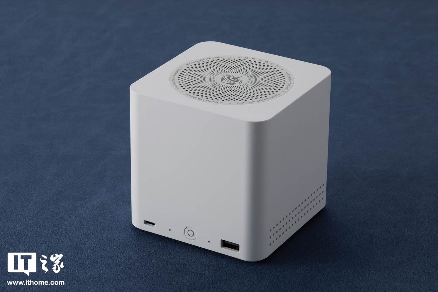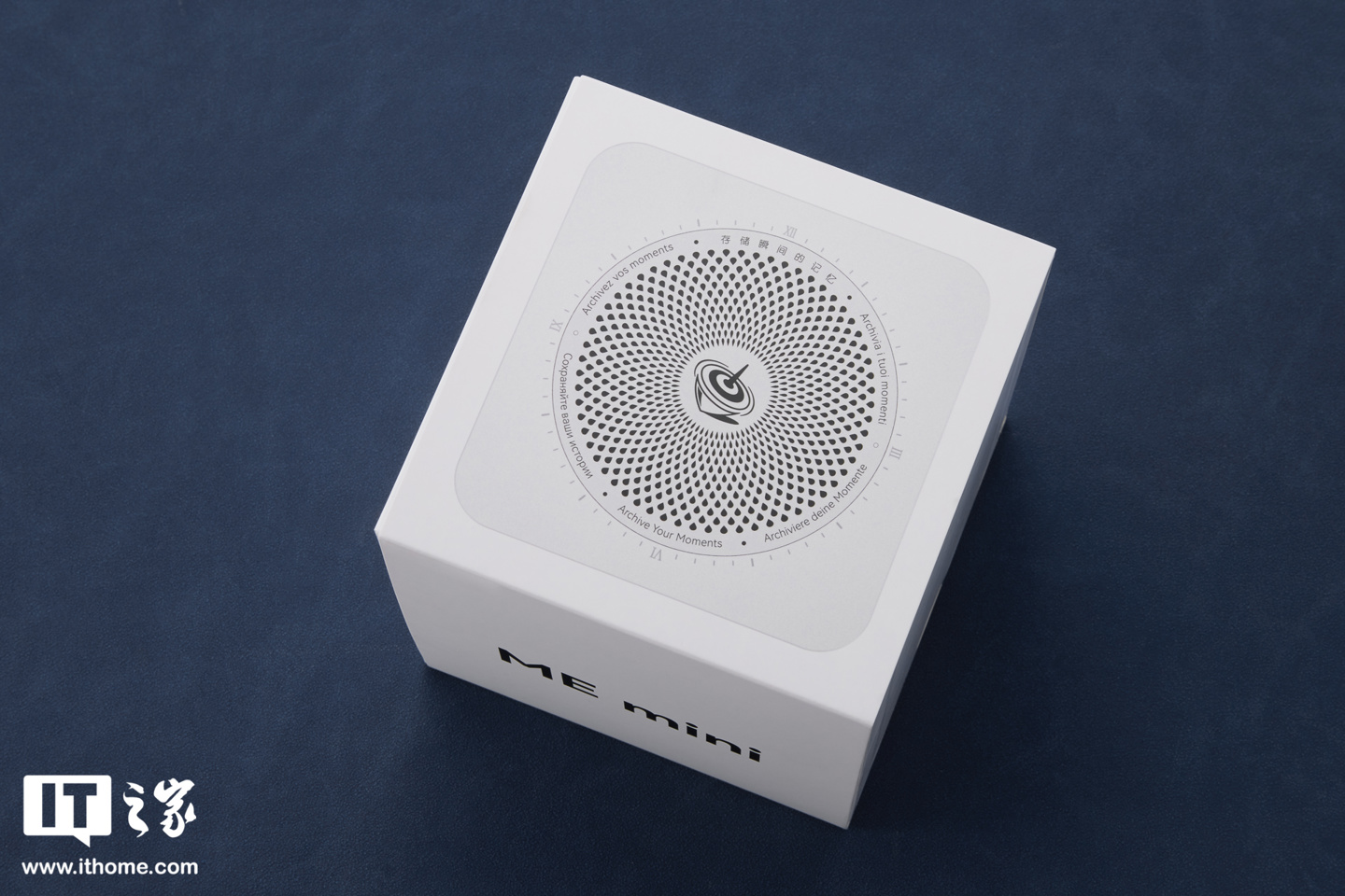 除去外包装,我们直接可以直接看到 ME mini 真机,其外形要比想象中更小,单面尺寸接近于手掌大小(具体为 99×99×98.3mm)。