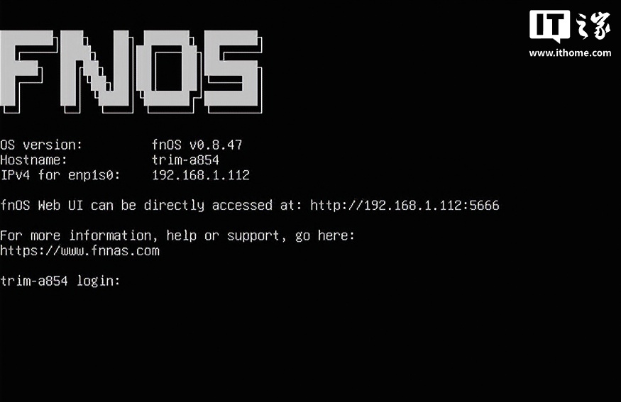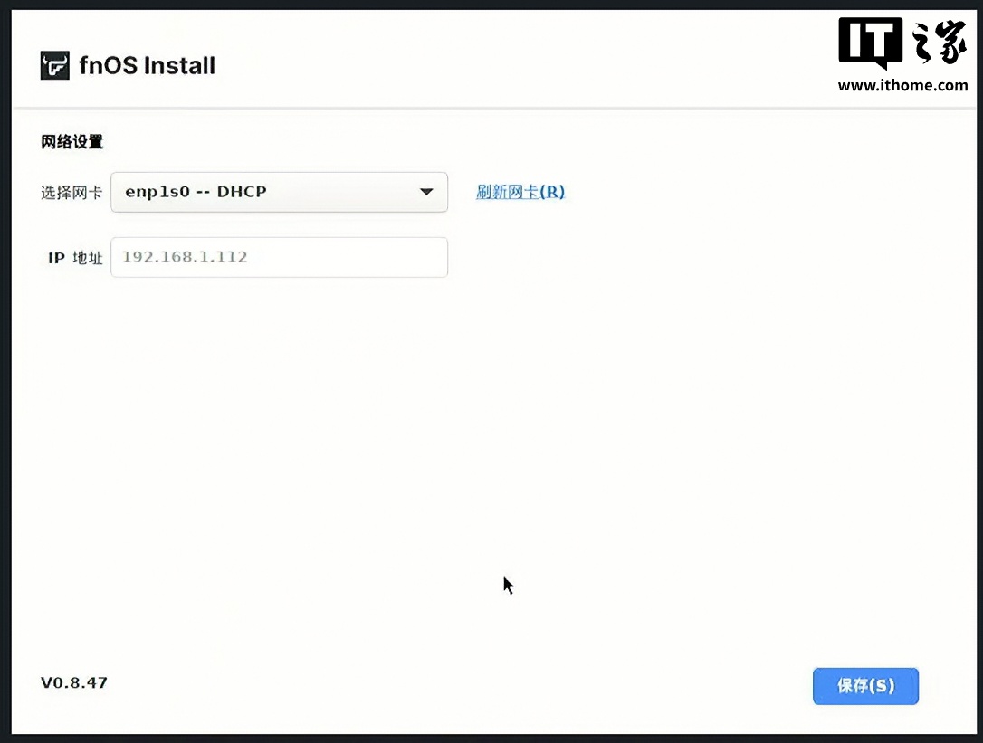 IT之家这里需要提醒大家的是:安装飞牛 OS 系统时应确保已插入网线(无线网卡暂不支持获取 DHCP 地址)。