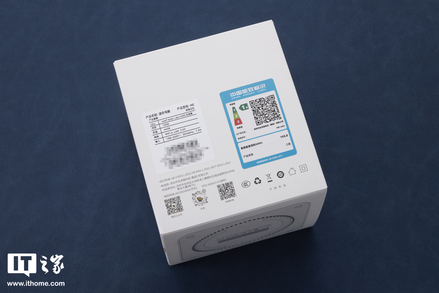 作为零刻 ME 系列首款存储设备,ME mini 包装十分简洁,整体提供了三层纸壳,贴有对应配置的参数规格和能效标识。
