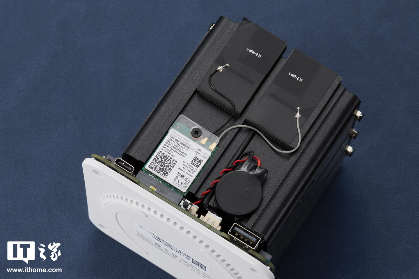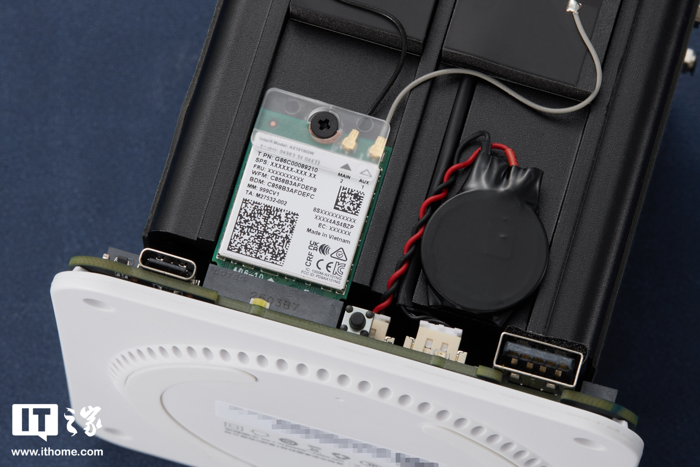 我们继续再看另一面,零刻 ME mini 正面明显可见原装 Intel AX101 无线网卡,同样采用立式 M.2 2230 插槽;且 WiFi、蓝牙天线模块及主板电池也位于这一面,天线模块面向塑料机壳,有效避免电磁屏蔽干扰信号。