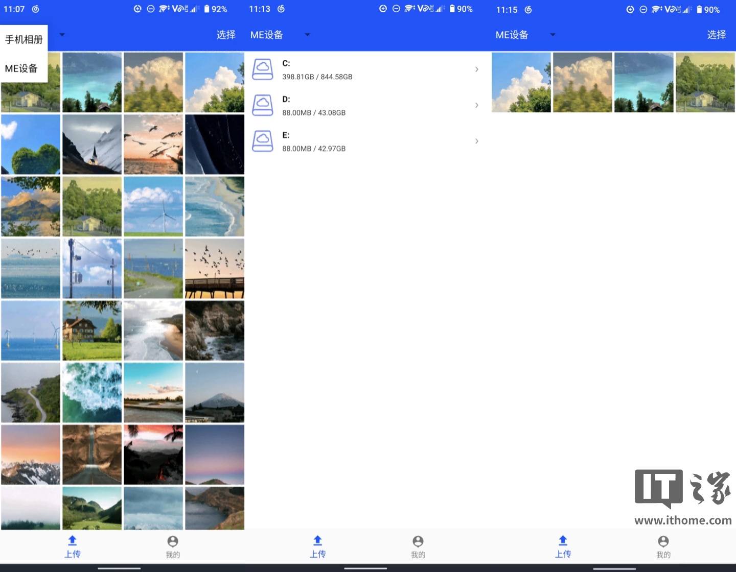 2.浏览 ME 设备内容:在首页左上角选择 “ME 设备”,界面将显示 ME mini 设备上的可用磁盘列表。点击目标磁盘,进入磁盘浏览界面即可查看已上传的照片。