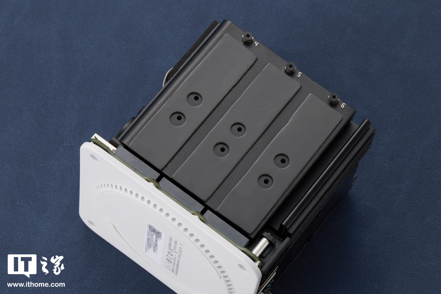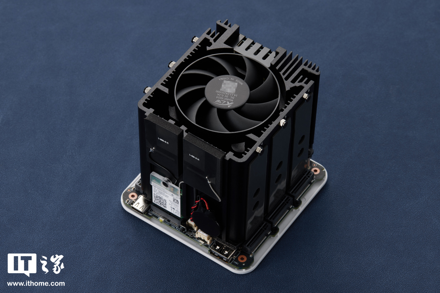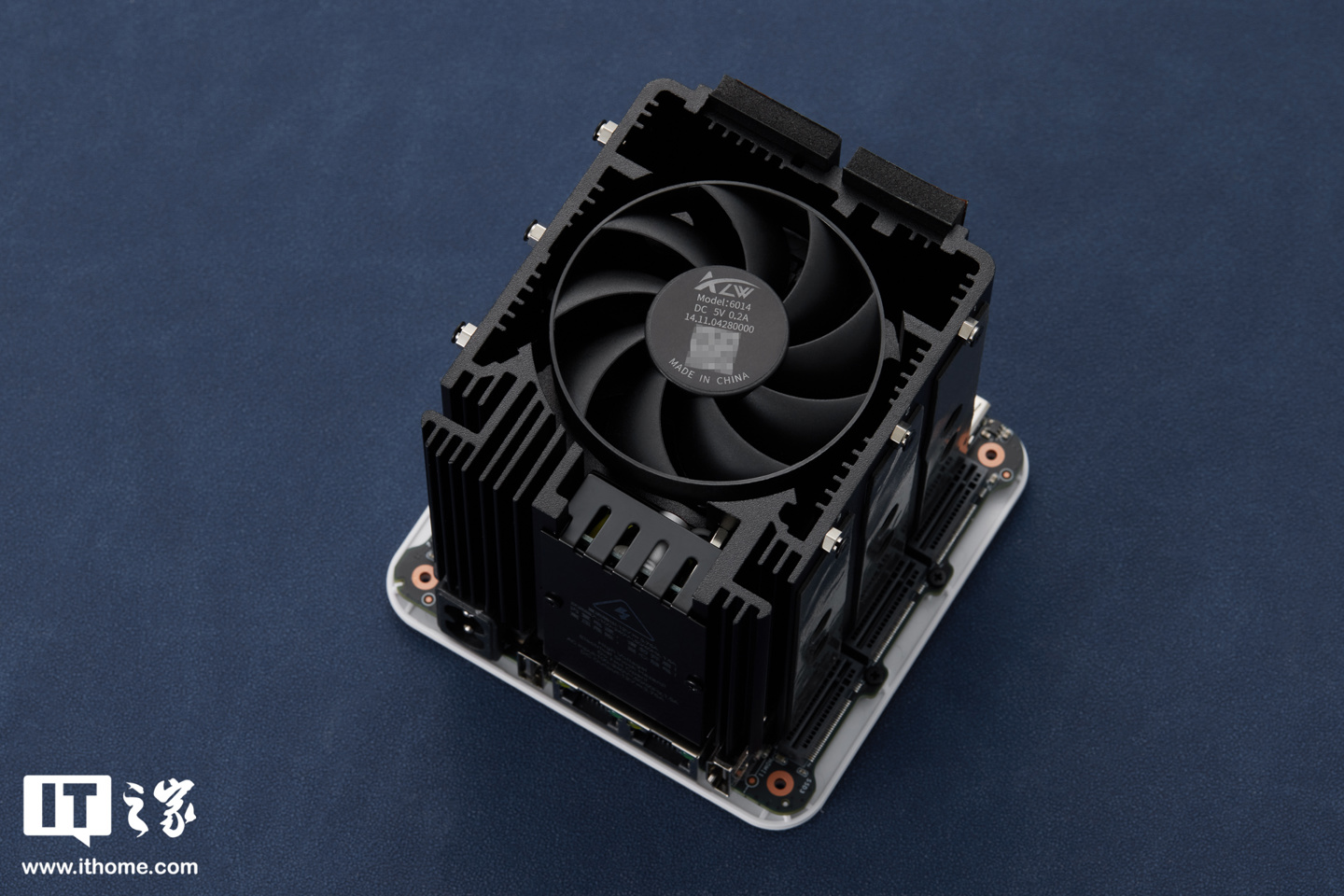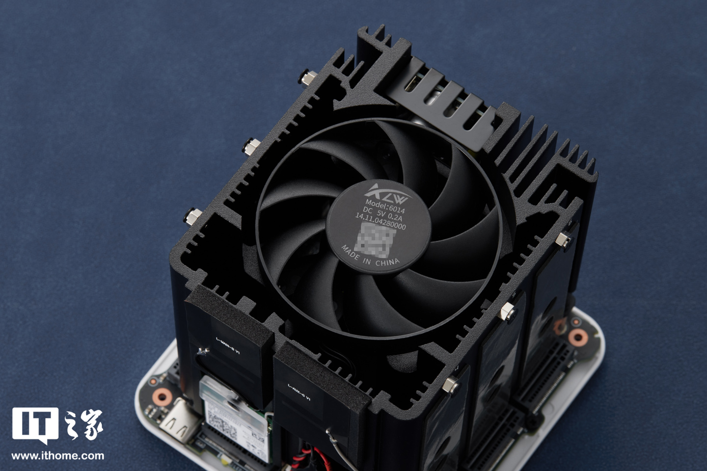 其顶部采用了一颗 6cm 的散热风扇(平均转速 1500rpm),向下向内直吹 CPU;且散热风扇四周一整圈都是铝合金散热鳍片,厚约 2.5~4.5mm,可帮助周围一圈 M.2 固态硬盘共同实现散热效果。
