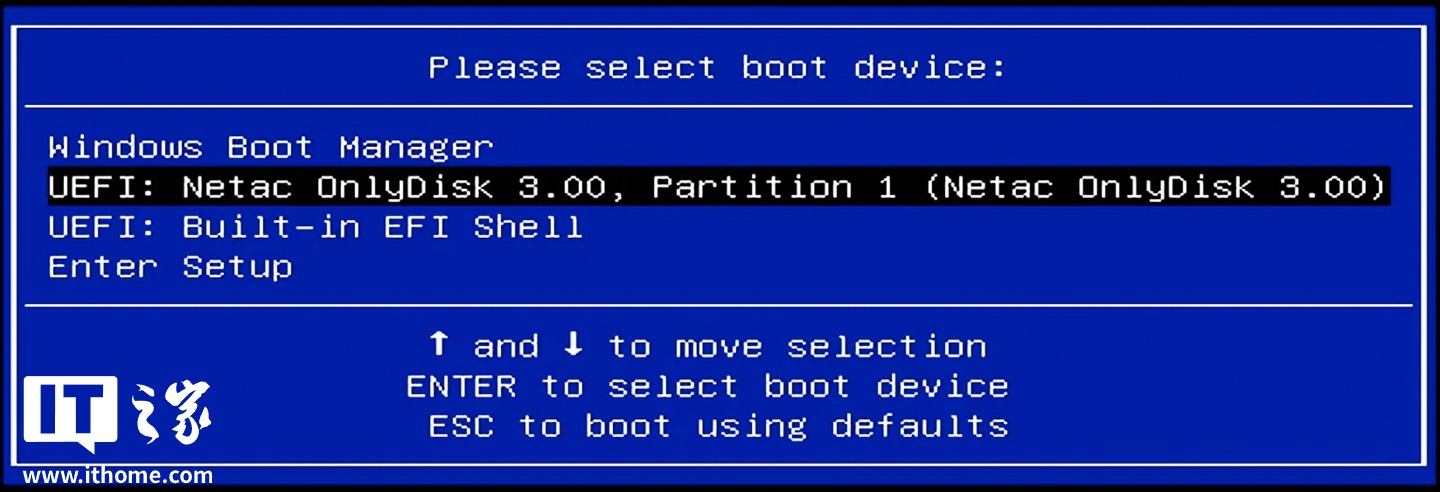 对于 ME mini 来说,我们可以在开机时按下键盘上的 F7 按键进入 Boot 选择界面,当然你也可以按 Del 键进入 BIOS 找到对应的启动项。这里选择刚刚制作的启动盘即可。