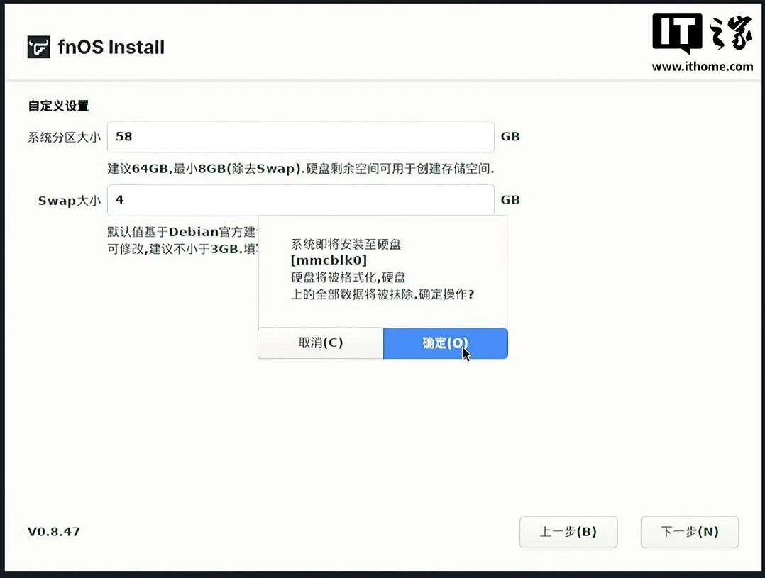 此时,我们可以使用方向键选择要用于系统安装的硬盘,也就是 ME mini 自带的 64GB eMMC 存储,然后设置系统分区及 Swap 大小(默认即可),确认格式化并完成安装。