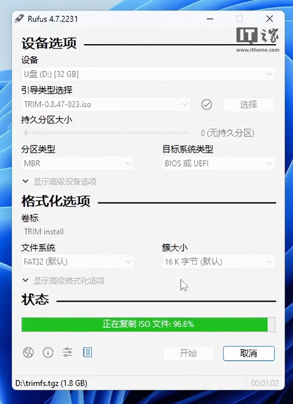 如果要想安装飞牛 OS,我们需要首先准备一个至少 16G 的 U 盘。将 U 盘插入电脑 USB 接口后,通过 rufus 等工具烧录一个飞牛 OS 镜像启动盘。等待进度条显示准备就绪,此时 U 盘引导盘已制作完成,可以安全拔出设备准备工作。