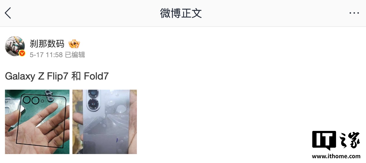 IT之家 5 月 20 日消息,博主“刹那数码”上周于微博发文,曝光了三星 Galaxy Z Flip 7、Fold 7 折叠屏手机的前盖板、后盖图,其中 Z Fold 7 的摄像头、闪光灯位置有所改动。