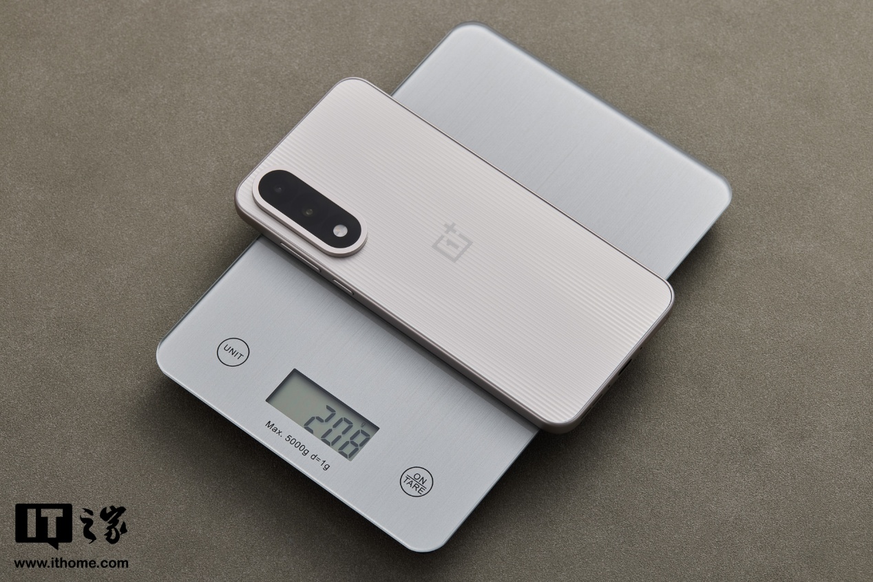 一加 Ace 5 至尊版为 6.83 英寸机身,但机身厚度仅有 8mm,还做了均衡配重和边框 R 角优化,镜头 Deco 包边优化等,重量也控制在 208g 左右,因此上手不显厚重,横竖握持手感都不错。