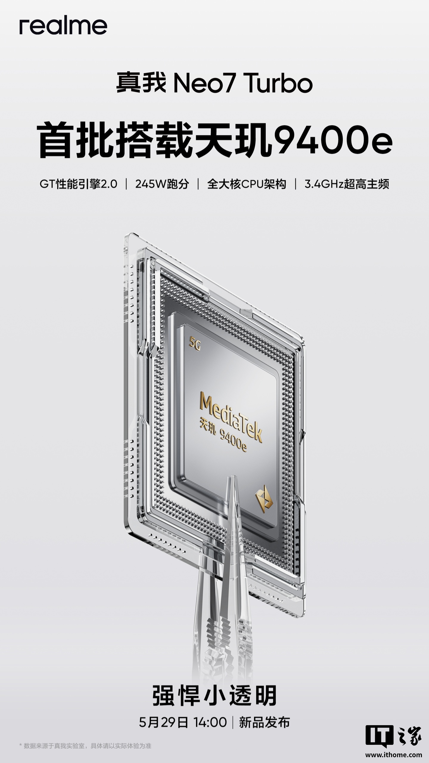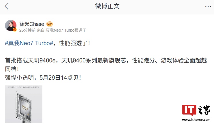 IT之家 5 月 21 日消息,真我 realme 副总裁、全球营销总裁、中国区总裁徐起今日发文宣布:真我 Neo7 Turbo 手机首批搭载天机 9400e 处理器。