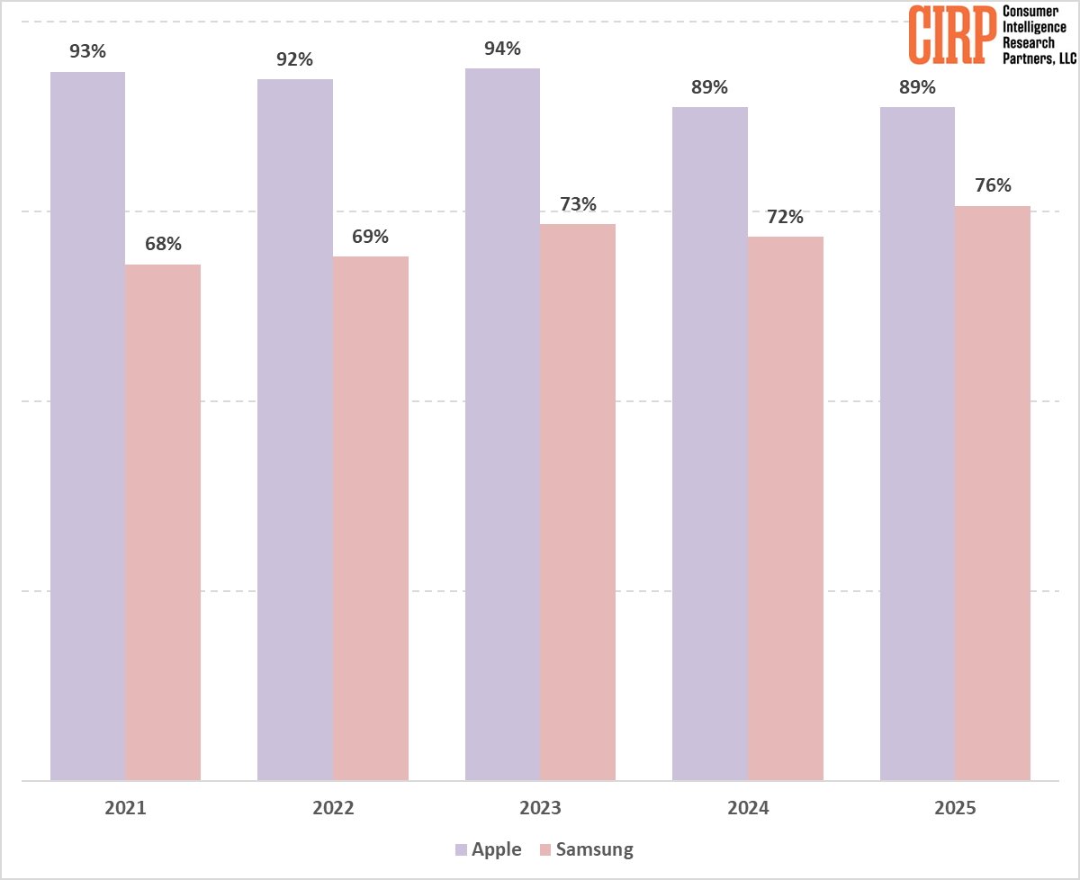 IT之家 5 月 22 日消息,市场调查机构 CIRP 昨日(5 月 21 日)发布博文,报道称在美国智能手机市场,苹果 iPhone 用户的品牌忠诚度(brand loyalty)虽仍高居行业榜首,但从 94%(2021 年)下滑至 89%(2025 年)。