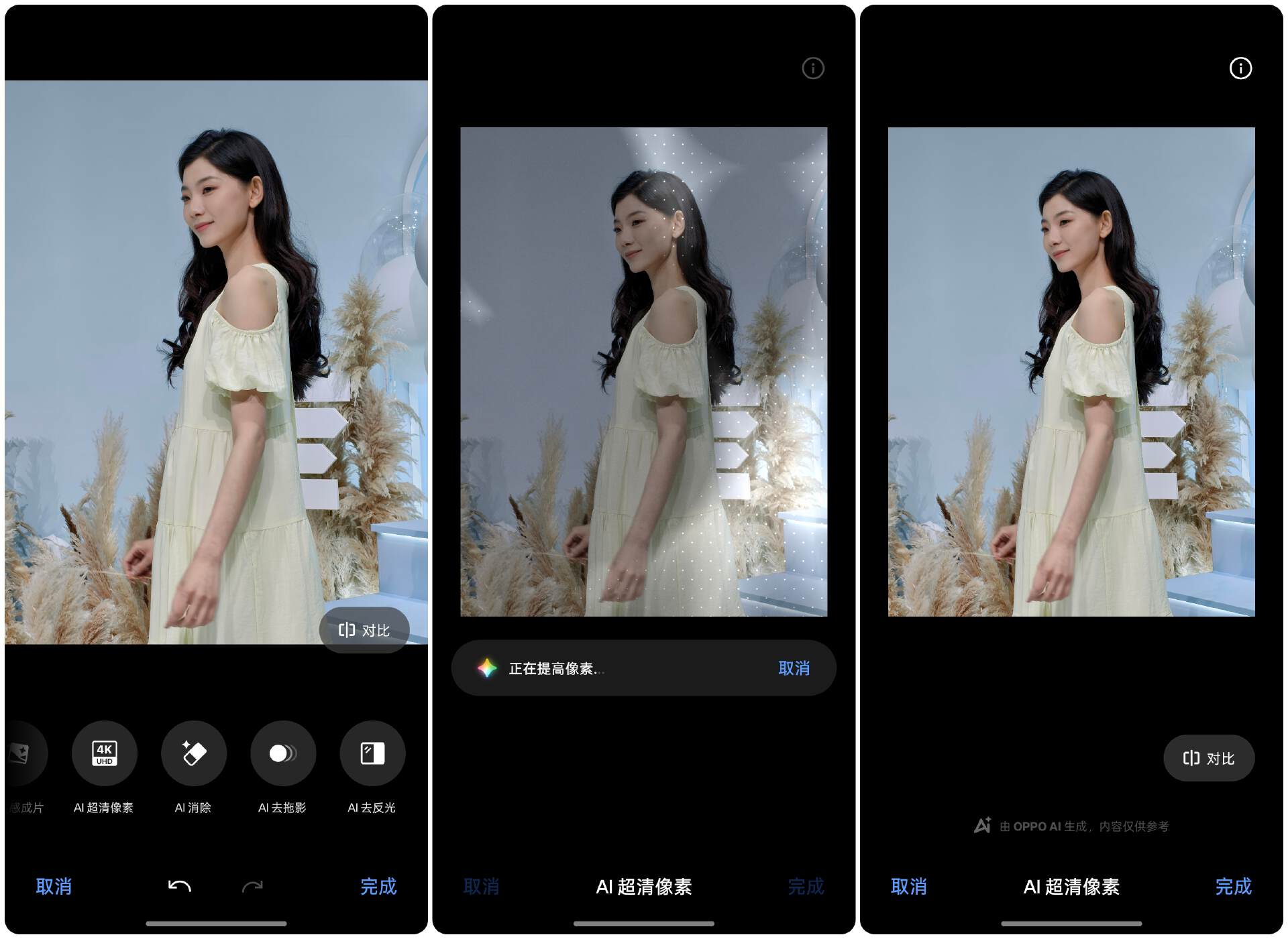 此外,OPPO Reno14 的 AI 图像助手,还带来了诸如 AI 灵感成片、AI 超清像素、AI 消除、AI 去拖影、AI 去反光等一系列功能。