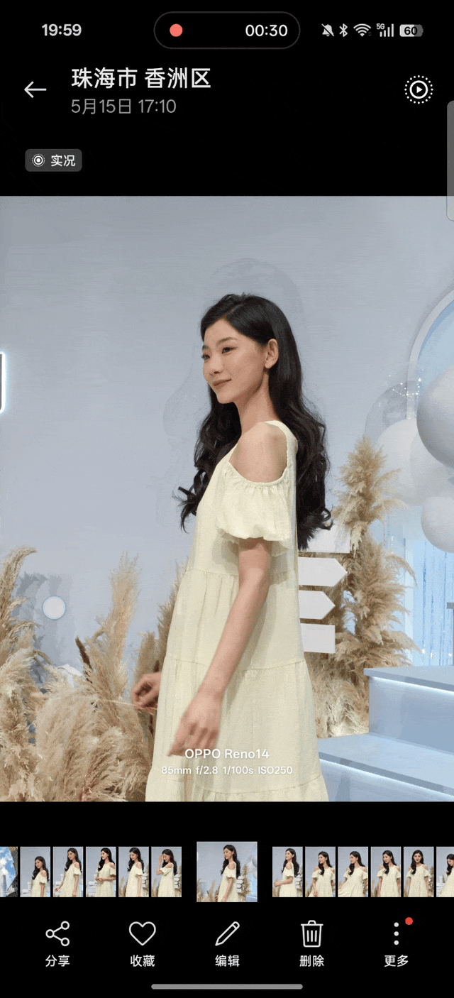 不仅仅是照片,OPPO Reno14 拍摄的 4K 视频,也支持自由截取 3 秒,变成实况图片,并且同样也支持多平台 HDR / Live 图分享。