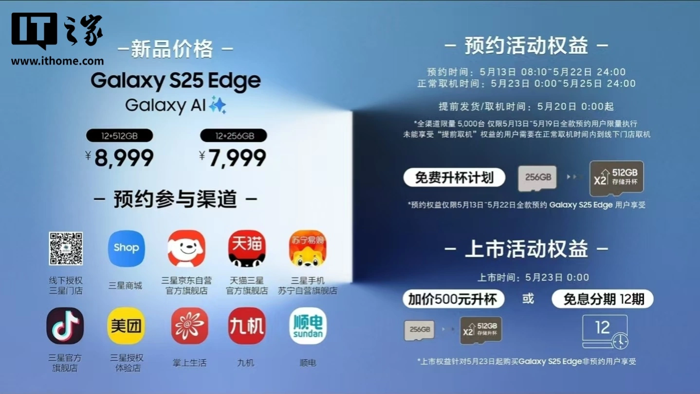 三星 Galaxy S25 Edge 国行售价 7999 元起,5 月 23 日正式上市。