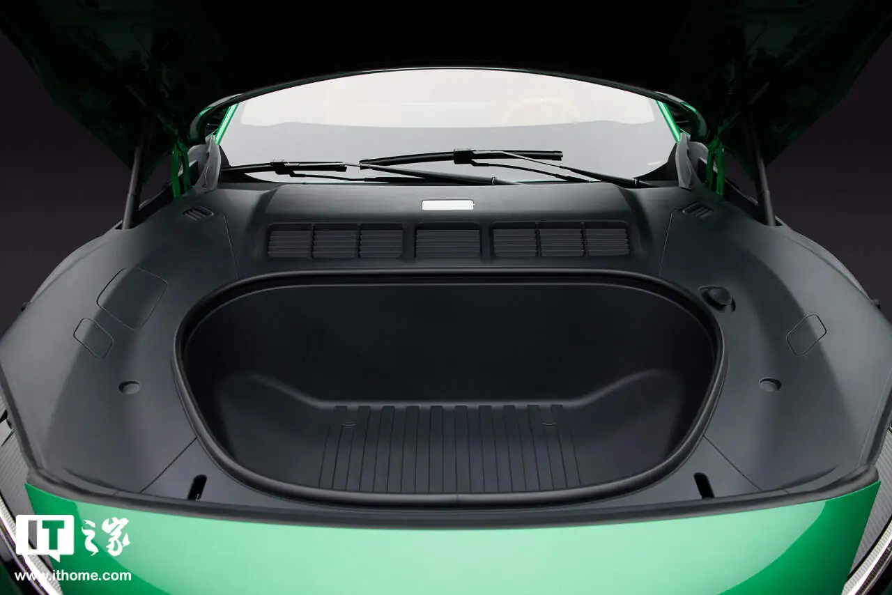 小米 YU7 搭载 3.11 ㎡量产车最大蚌式铝机盖(1960×1587mm),机盖之下容纳了 141 L 的超大电动前备箱,最多支持 8 种开合方式;还可选 275 mm 后宽胎。