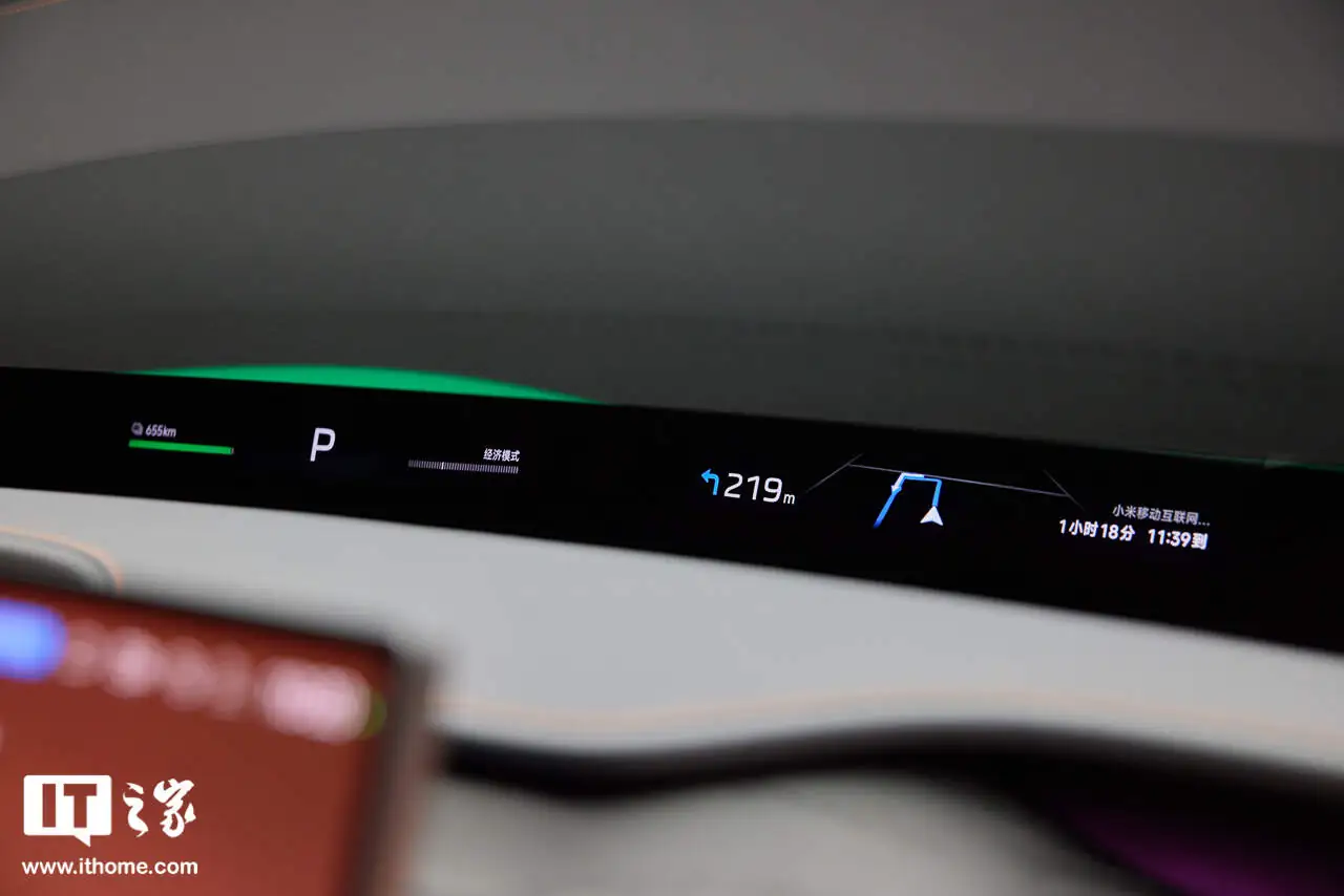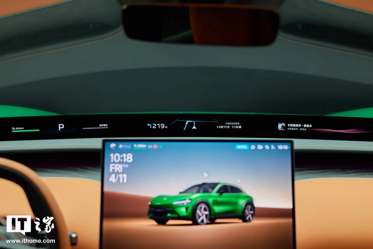 座舱科技交互方面,小米 YU7 保留了小米 SU7 的前排 16.1 英寸中控大屏和后排两块拓展屏,还新增了小米天际屏全景显示以及后排移动控制屏 —— 采用 3 块 Mini LED 屏幕,通过「全景曲面投影技术」,将信息反射到前风挡下黑区。