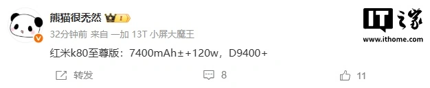 IT之家 5 月 23 日消息,博主 @熊猫很禿然 今日爆料称,小米 REDMI K80 至尊版手机搭载天玑 9400+ 处理器、7400mAh 电池、120W 快充。