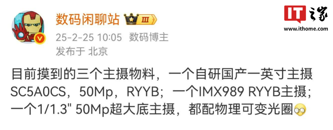 在摄像头方面,该机此前被曝将搭载 50Mp IMX989 可变光圈主摄 + 50Mp 小底超广角 + 50Mp 小底潜望长焦微距,三摄均为定制 RYYB。不过相应手机规格尚未定版,并不能代表最终实机情况。