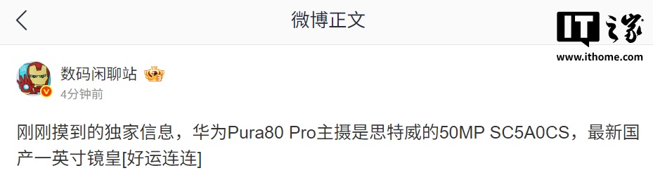 IT之家 5 月 26 日消息,博主 @数码闲聊站 今日发布爆料消息称,华为 Pura80 Pro 主摄是思特威的 50Mp SC5A0CS,最新国产一英寸镜皇。