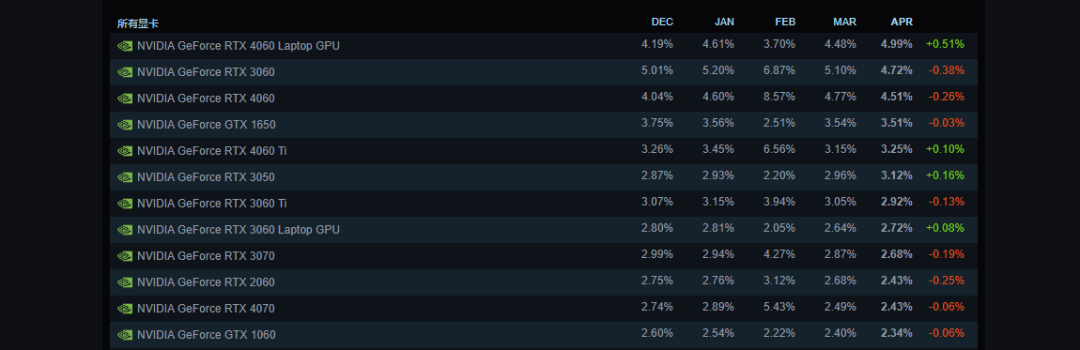 而在Steam每月更新的显卡统计表中,我们可以看到热门型号主要是RTX 4060 Laptop、RTX 3060、RTX 3060Ti等中端显卡,甚至连多年前的GTX 1050和GTX 1060都占有一席之地,高端显卡这边,甚至连次一级的RTX 4080都鲜少有人提及。