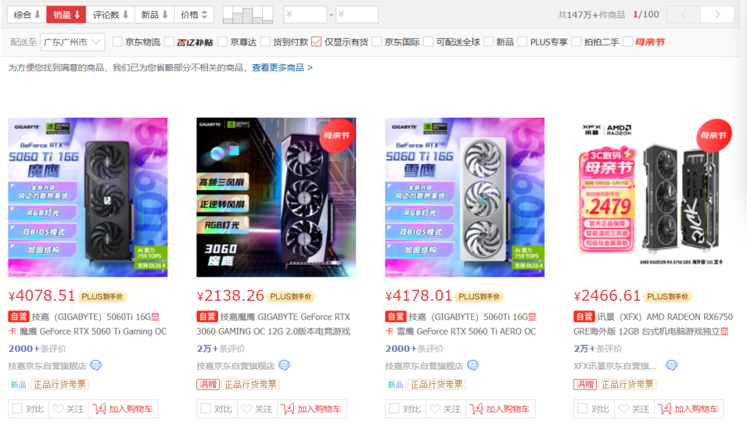 首先,从京东平台的显卡销量分布就不难看出,3000-5000元价位段的显卡才是市场的销售主力,主要集中在RTX 3060/RTX 4060/RTX 5060这种中端入门型号,相对应的,隔壁苏妈的RX6750 GRE同样有着不错的销量。