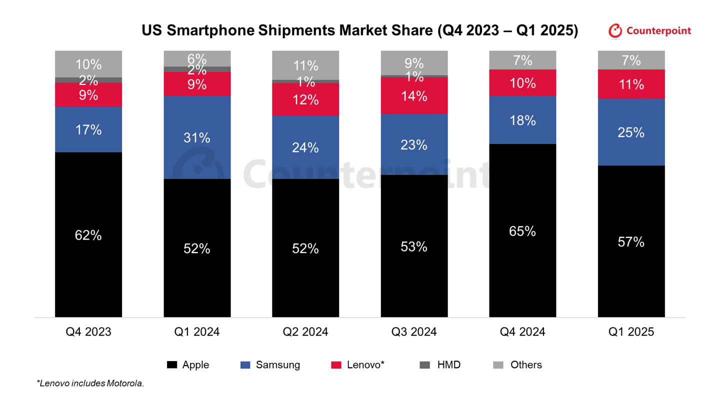 该机构还分享了 2025 年第 1 季度美国市场智能手机出货量报告,同比增长了 9%,苹果公司由于 iPhone 16e 的发布,市场占有率为 57%,刷新了苹果历年第 1 季度美国出货量占比。