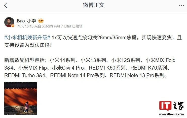 IT之家 5 月 27 日消息,小米相机部的产品经理 @Bao_小李 昨日发文说明,小米相机焕新升级后,1X 可快速点按切换 28mm / 35mm 焦段,实现快速变焦,且支持设置为默认焦段。新增适配机型如下: