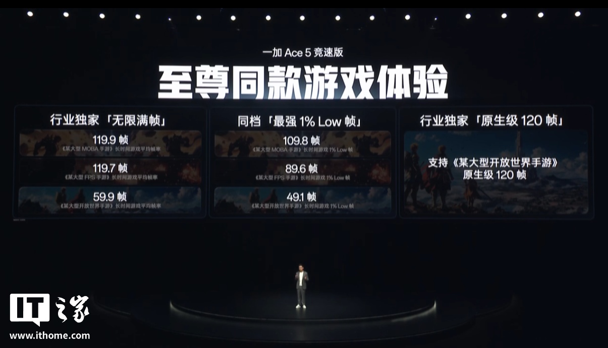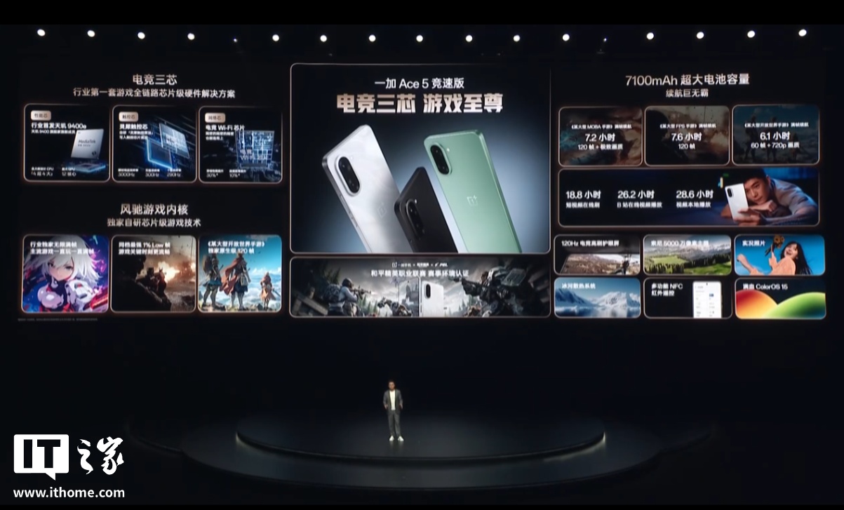 一加 Ace 5 竞速版手机与至尊版一样,搭载行业独家「电竞三芯」,自研的「风驰游戏内核」出厂写入行业首发的天玑 9400e 芯片底层,号称“行业独家「无限满帧」,主流游戏连续 5 小时以上一直玩一直满帧;满帧之上,1% Low 帧断档领先,关键时刻不卡顿;行业独家「原生级 120 帧」游戏表现”。