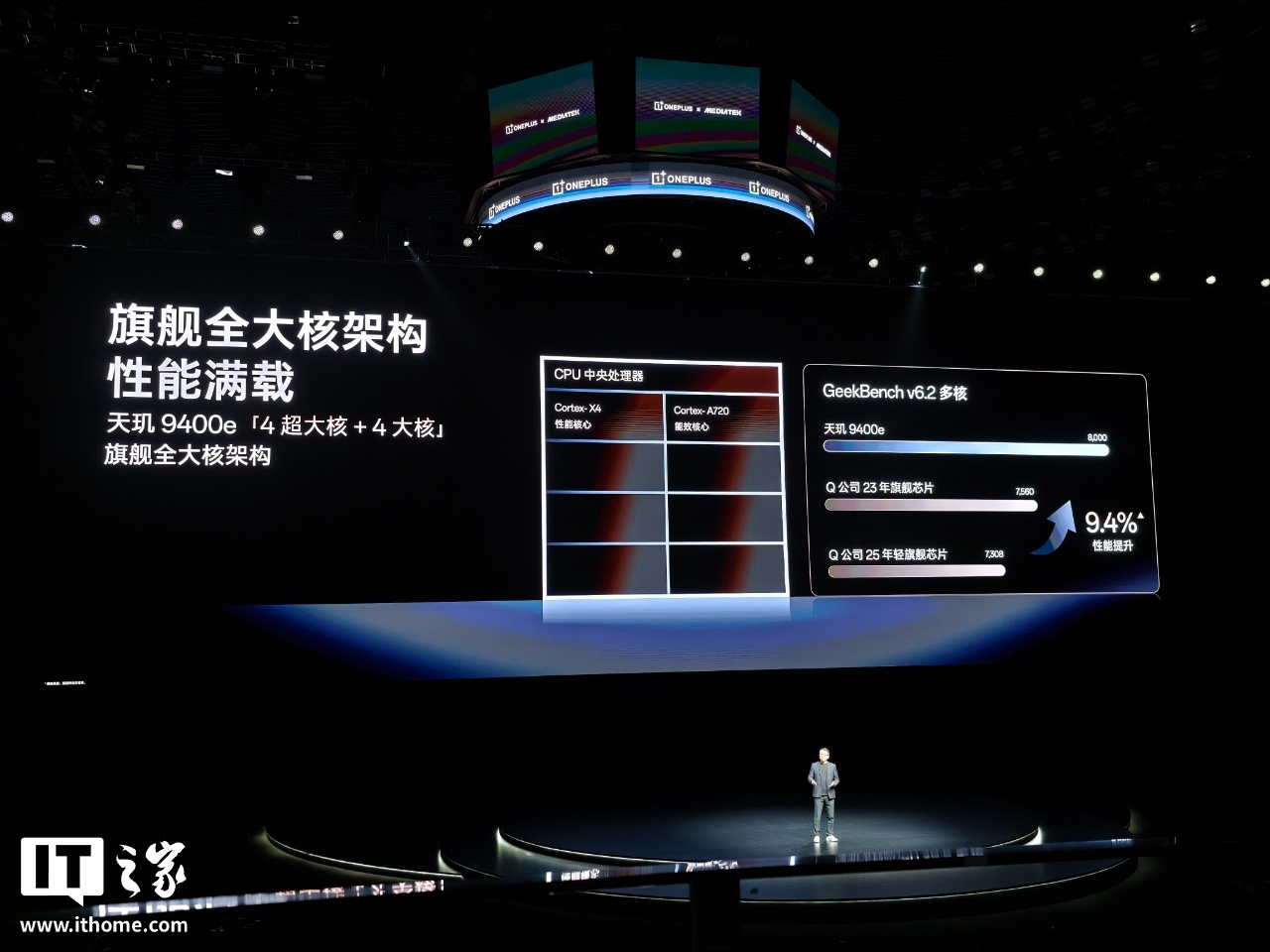 据介绍,全新天玑 9400e 处理器是天玑 9400 旗舰家族新成员,号称“一脉相承旗舰基因”。处理器的 CPU 采用「四超大核 + 四大核」 旗舰全大核架构设计、旗舰 12 核心 GPU,支持最新版本星速引擎。该处理器拥有同级最大缓存配置,内置天玑 9400 无线模块,支持最新版本天玑 AI 开发套件