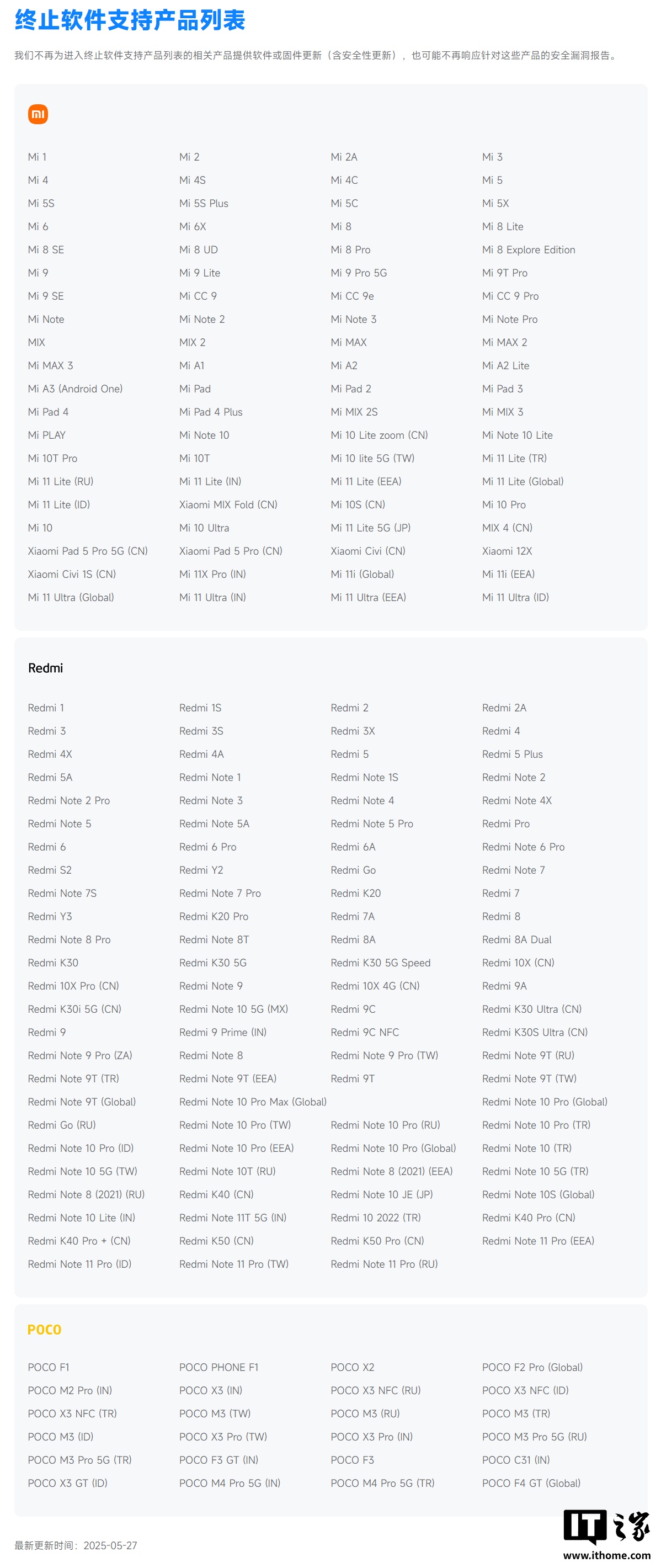IT之家 5 月 28 日消息,小米安全中心终止软件支持产品列表于 5 月 27 日更新,新增多款机型。IT之家汇总如下: