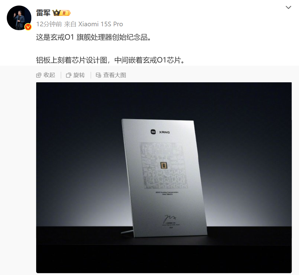 IT之家 5 月 28 日消息,小米创办人、董事长兼 CEO 雷军今日公布了小米玄戒 O1 旗舰处理器创始纪念品。据介绍,该款纪念品铝板上刻着芯片设计图,中间嵌有玄戒 O1 芯片。