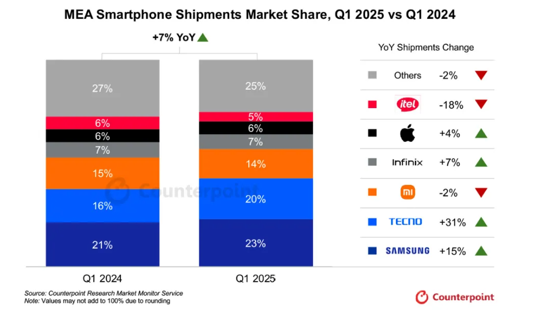 IT之家 5 月 29 日消息,根据 Counterpoint 的最新报告,2025 年 Q1 中东和非洲智能手机出货量同比增长 7%,这是该地区在经历连续两个季度下滑后,首次实现同比正增长。