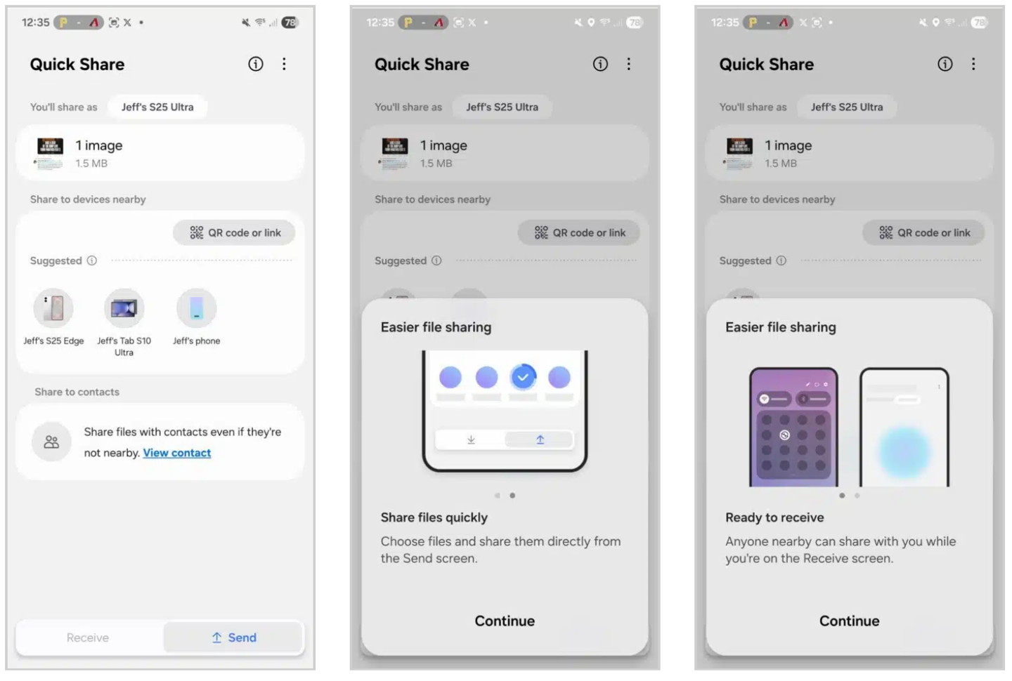 Quick Share 新增发送和接收文件的独立标签,用户可直接在应用内选择并快速分享文件。