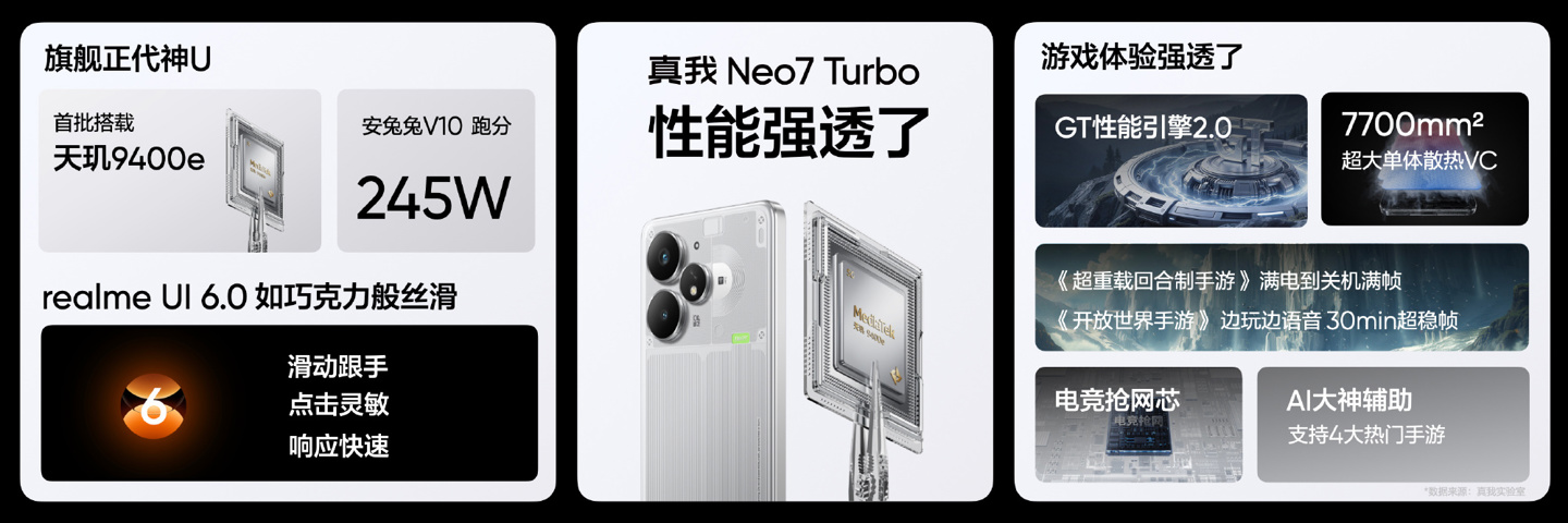 真我 Neo7 Turbo 首批搭载天玑 9400e,全大核 CPU 架构,安兔兔 V10 性能跑分超 245W;旗舰同款大气流冷锋散热系统,7700mm² 超大单体 VC。此外,该机还搭载 GT 性能引擎 2.0,号称“满电到关机无限稳帧”,搭载 AI 大神辅助 + 电竞抢网芯。
