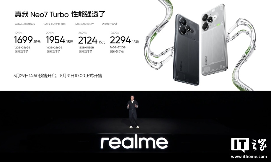 IT之家 5 月 29 日消息,realme 今日发布真我 Neo7 Turbo 手机,新品搭载天玑 9400e 芯片以及 7200mAh 电池,首发 1999 元起,国补价 1699.15 元起。今日 14:50 预售开启,5 月 31 日 10:00 正式开售。