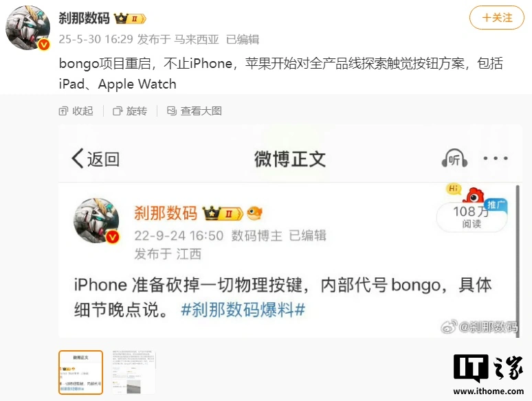 IT之家 5 月 30 日消息,据博主 @刹那数码 今日爆料,苹果内部代号 bongo 的项目重启,不止 iPhone,苹果开始对全产品线探索触觉按钮方案,包括 iPad、Apple Watch。