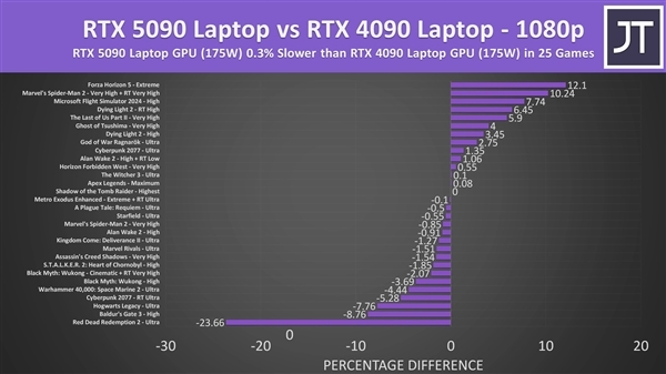 在更高的4K分辨率下,RTX 5090移动版也仅比RTX 4090快了3%,在测试的25款游戏用,只有3款游戏在RTX 5090上帧数提升了10%以上。