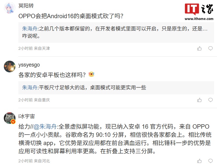 另外,朱海舟还在评论区回复了部分网友的问题:针对 OPPO 是否会砍掉 Android16 的桌面模式,他表示“之前几个版本都保留的,在开发者模式里面可以开启,只是原生的,还是… 咋说呢”;针对各家的安卓平板是否也这样,他回复“平板尺寸足够大的话,桌面模式可能更实用一些”。