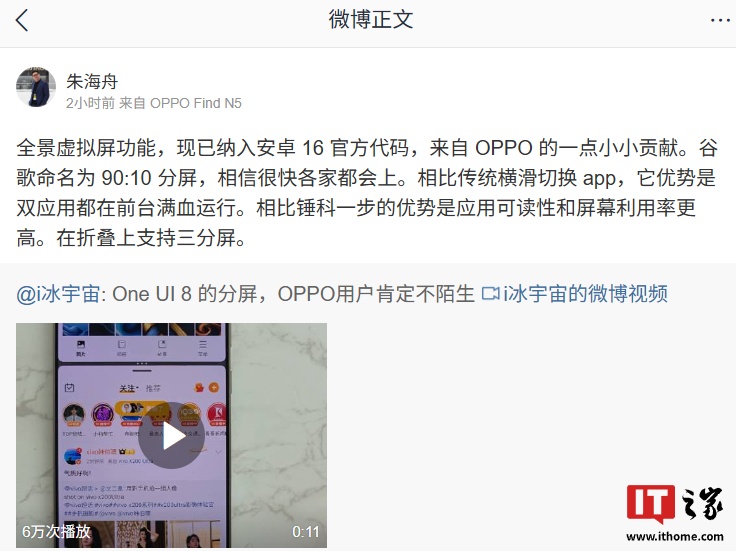 IT之家 6 月 3 日消息,OPPO 软件产品经理朱海舟今日发文称:“全景虚拟屏功能,现已纳入安卓 16 官方代码,来自 OPPO 的一点小小贡献。谷歌命名为 90:10 分屏,相信很快各家都会上。”