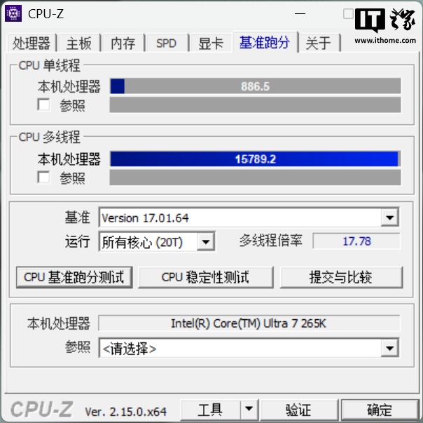 在 CPU-Z 自带的基准跑分测试中,酷睿 Ultra 7 265K 处理器的单线程分数为 886.5 分,多线程分数为 15789.2 分,表现强势。